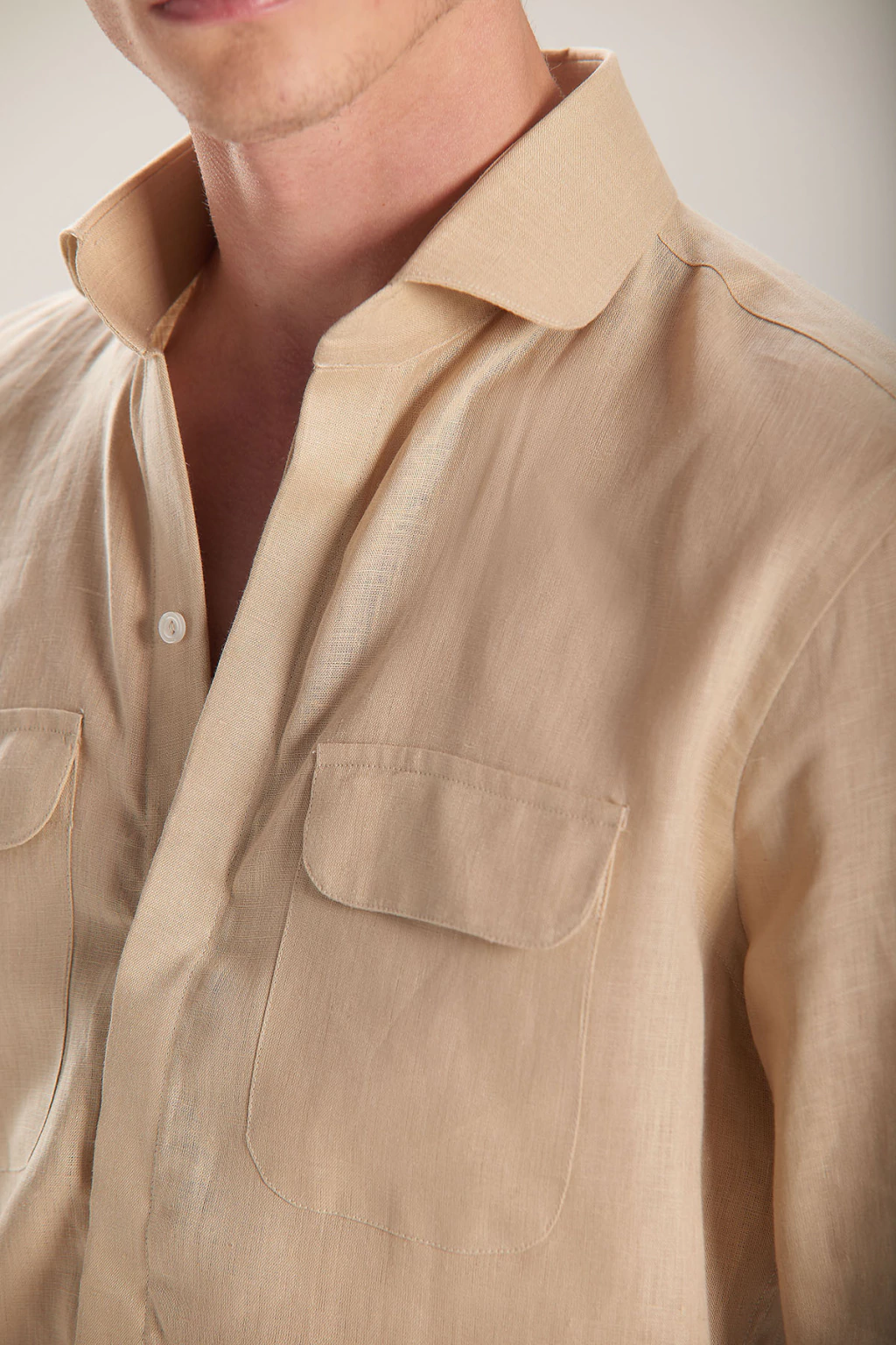 Camisa em linho premium areia, com modelagem Classic que equilibra conforto e estrutura. A peça possui vista coberta com haste flexível rígida, que garante caimento impecável no peito e estrutura à frente da camisa. Destaque para os dois bolsos com lapela sem botões, que remetem à estética utilitária chique. O colarinho arredondado rígido complementa a sofisticação da construção.