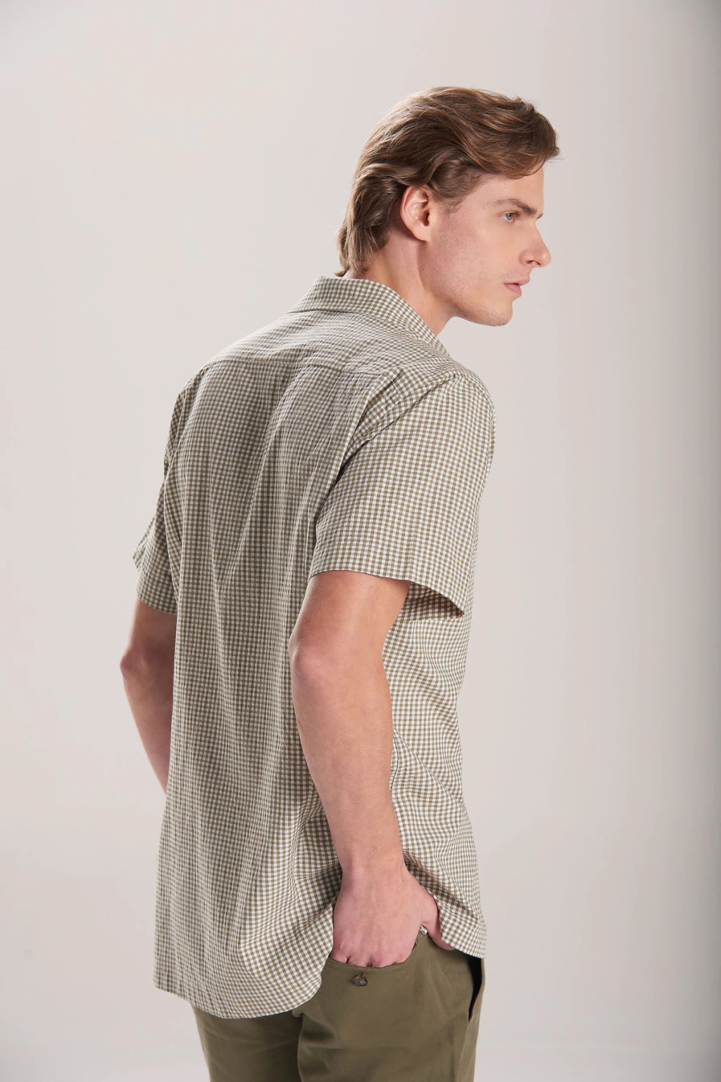 Camisa em tecido anarruga xadrez bege e branco, com textura natural e toque fresco. Modelagem Classic Relax, levemente acinturada, com barra reta e aberturas laterais reforçadas para maior conforto. Gola cubana aberta, e bolso frontal com prega central, que traz um detalhe de personalidade e utilidade à peça. Uma construção equilibrada entre o casual refinado e a estética autoral.