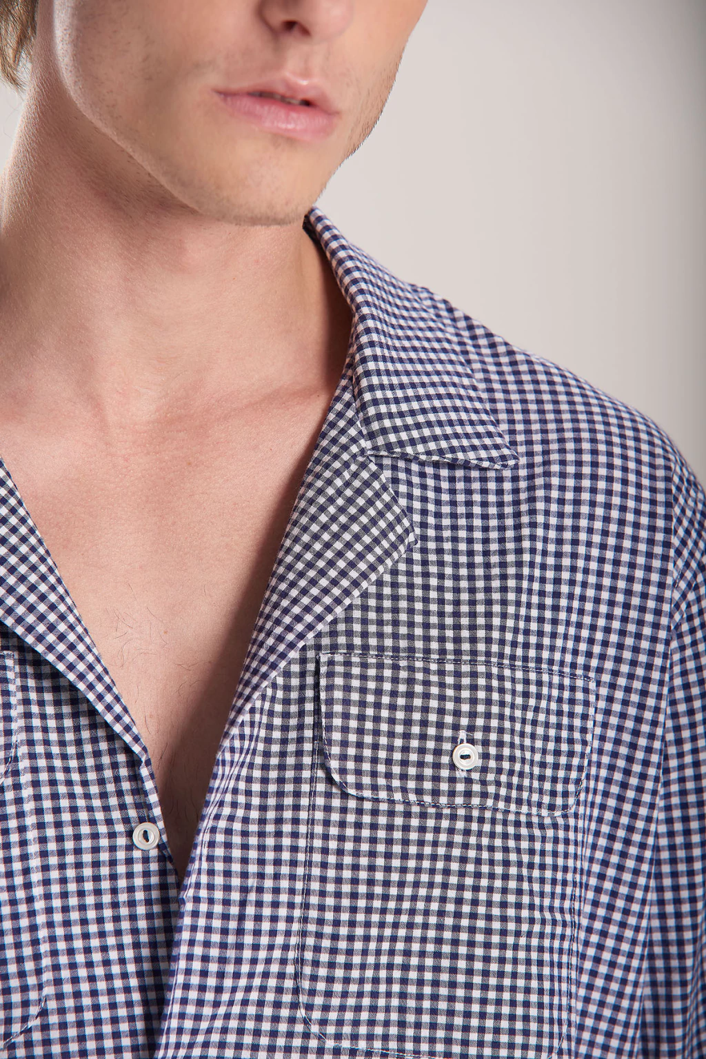 Camisa em tecido anarruga xadrez preto e branco, com textura amassada natural que dispensa passadoria. Modelagem Classic Comfort, de caimento solto e estruturado. Gola cubana aberta, que reforça o espírito leve da peça. Dois bolsos frontais com lapela arredondada, valorizando o visual utilitário com refinamento. Uma peça versátil, que transita com naturalidade entre o urbano e o veraneio.