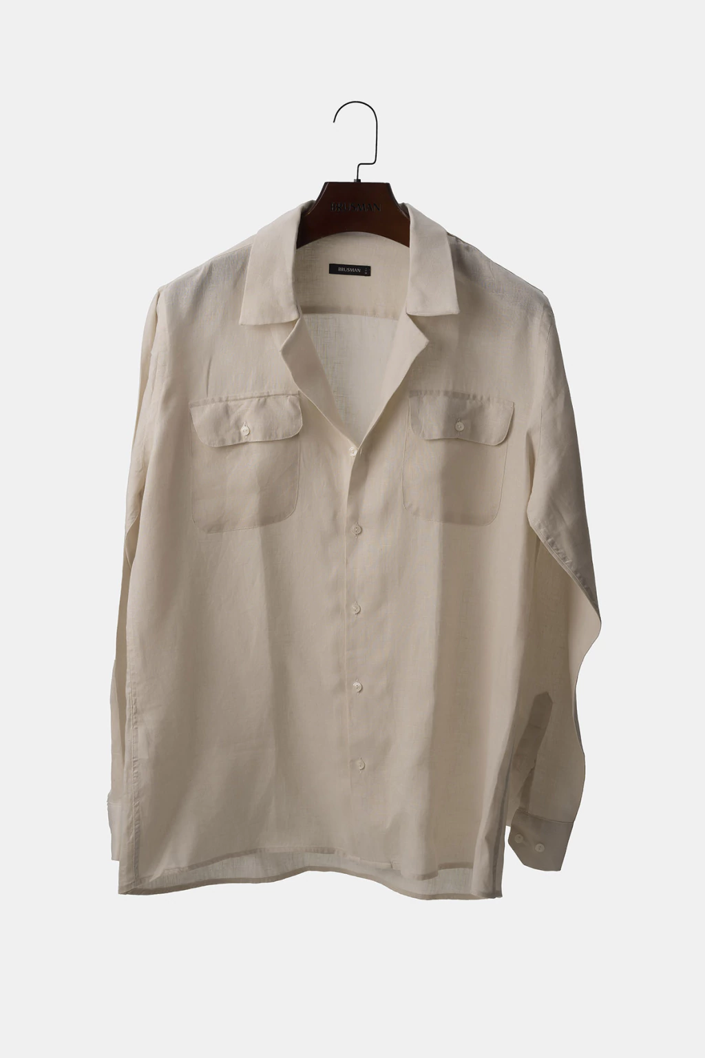 Camisa confeccionada em linho cru, com textura natural e aparência suave. Modelagem Classic Comfort, de caimento solto com estrutura refinada. Gola cubana aberta, que reforça o visual relaxado e elegante. Possui dois bolsos frontais com lapela arredondada e fechamento por botão, conferindo personalidade e utilidade à peça. Ideal para dias solares com presença leve e sofisticada.