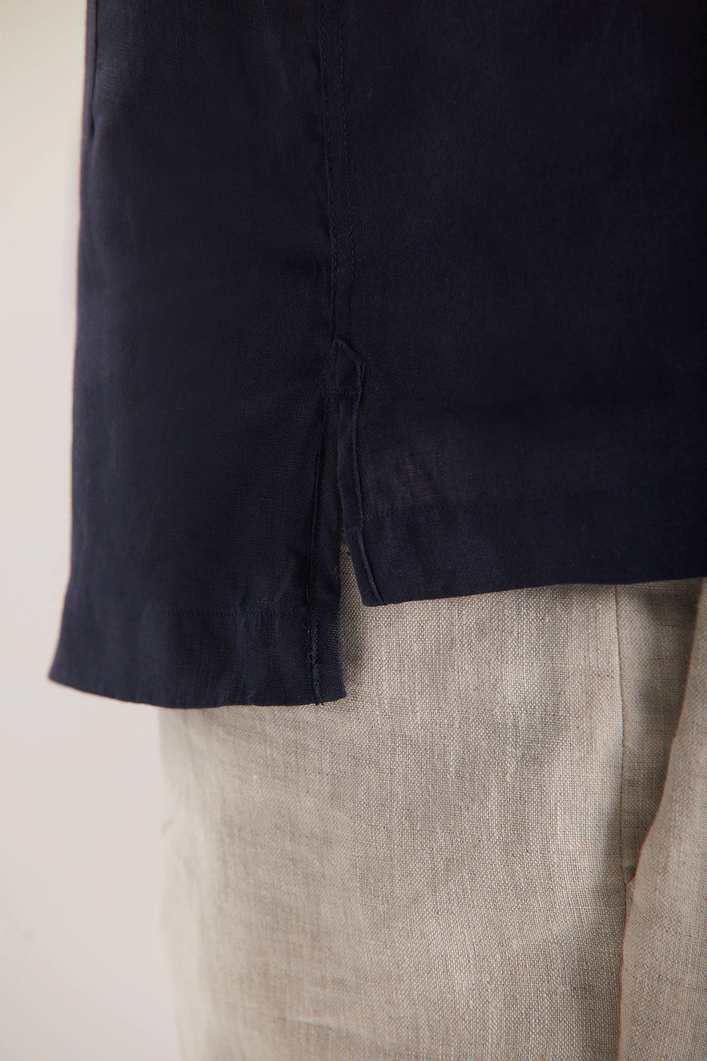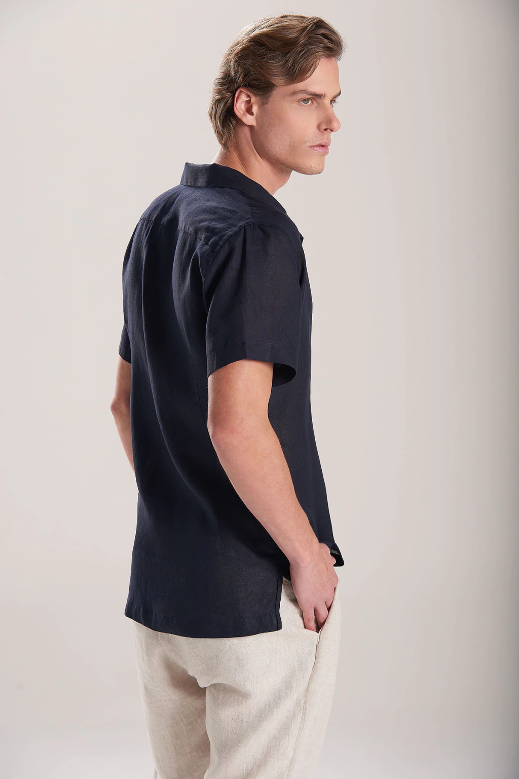 Camisa em linho, com textura leve e construção respirável. Modelagem Classic Relax, levemente acinturada, com barra reta e aberturas laterais reforçadas. Gola cubana aberta, que valoriza o colo e traz informalidade elegante. Finalizada com botões de madrepérola natural, que adicionam brilho sutil ao tom escuro. Uma peça ideal para noites tropicais, eventos descontraídos ou composições minimalistas com presença.