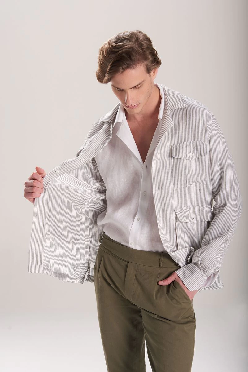 Parka masculina confeccionada em linho puro com listras finas em tom claro. Modelagem alongada e levemente ampla, com quatro bolsos frontais com lapelas e fechamento por botão. A gola cubana reforça o espírito leve e tropical da peça, enquanto a estrutura utilitária garante versatilidade e estilo. Ideal para sobrepor camisas ou camisetas nos dias mais quentes, com elegância funcional e toque artesanal.
