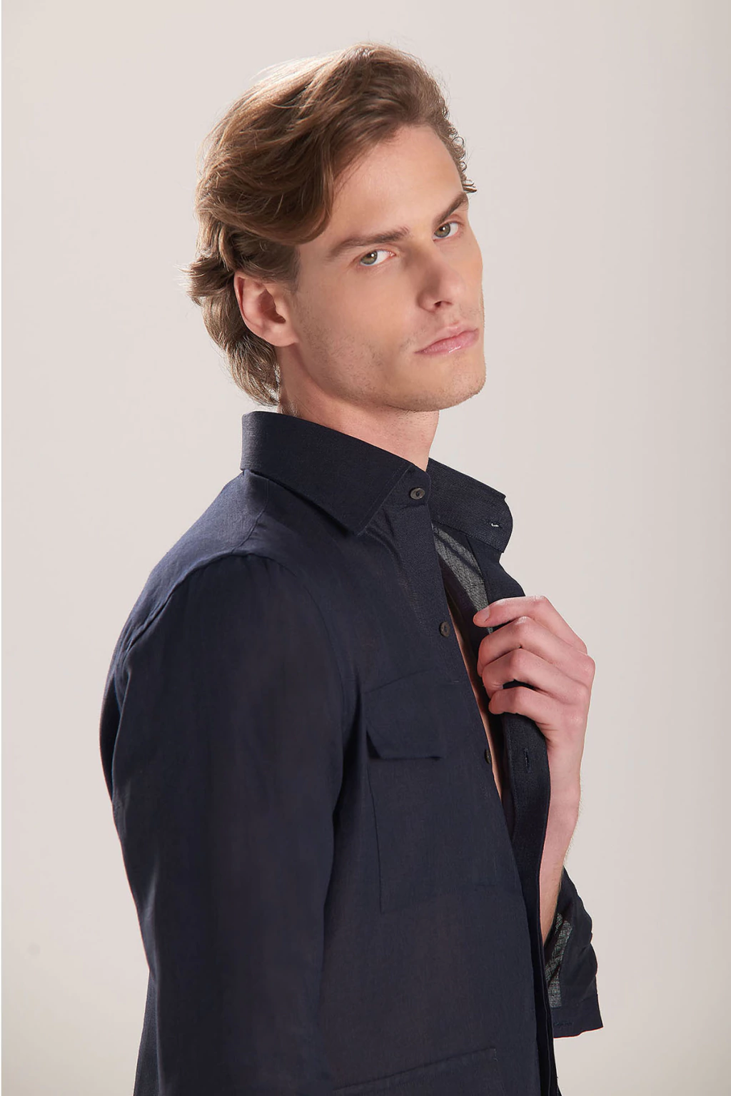 Camisa confeccionada em linho marinho intenso, com modelagem Classic Alongada, que valoriza o comprimento e o caimento.